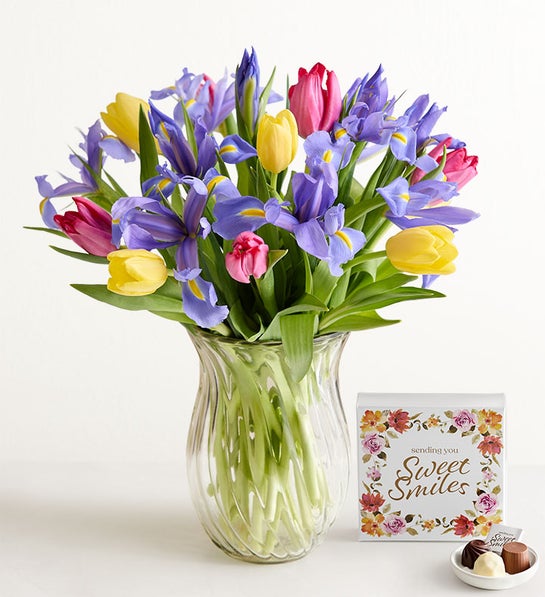A mother’s love is infinite, just like the beauty of this lush bouquet. Pink and yellow tulips are paired with rich blue irises to create a breathtaking tribute to Mom, and to Mother Nature.